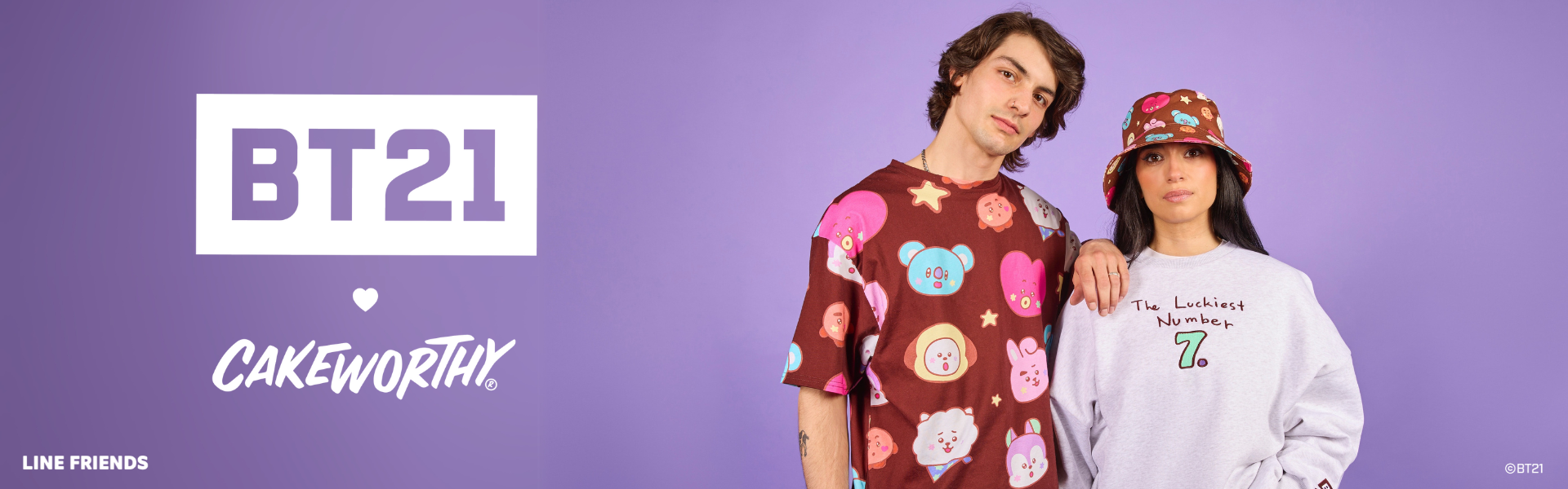 Step into the universe of BT21 with Cakeworthy’s official collection of apparel and accessories, where bold style meets your favorite characters, KOYA, RJ, SHOOKY, MANG, CHIMMY, TATA, and COOKY.