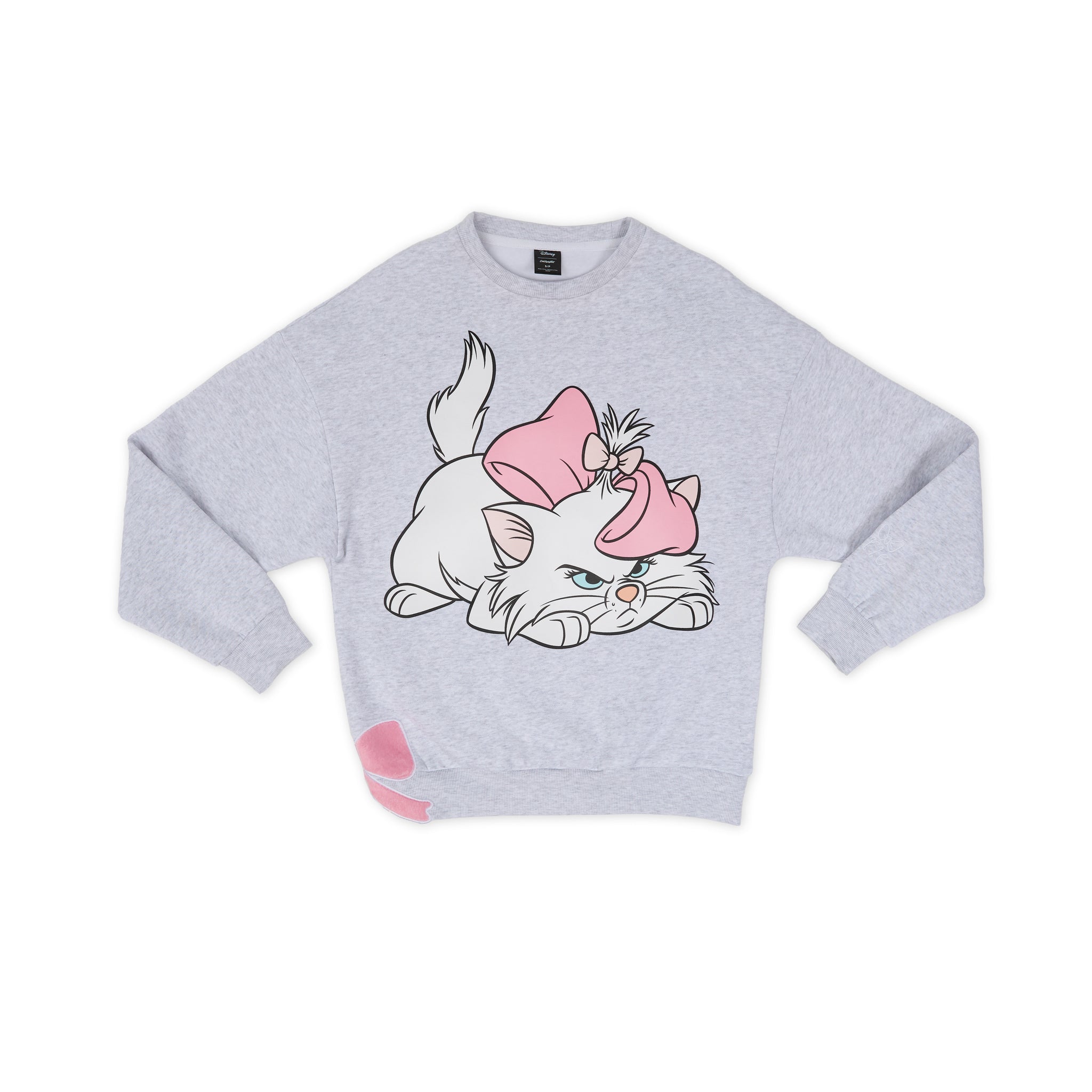 Add a little feline flair to your wardrobe with our Disney’s The Aristocats Marie Embroidered Crewneck. Featuring a printed graphic of Disney’s Marie front and center, “Marie” stitched on the sleeve, and a big pink appliqué embroidered bow on the hem.
