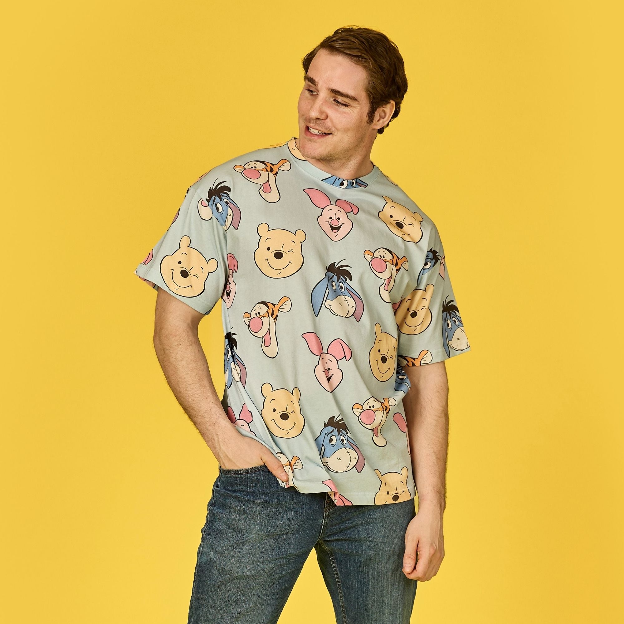 You’ll have many adventurous adventures in our Disney’s Winnie the Pooh Toss Print T-Shirt! This drop sleeve tee features an all-over print pattern of Disney’s Pooh Bear, Tigger, Piglet, and Eeyore!