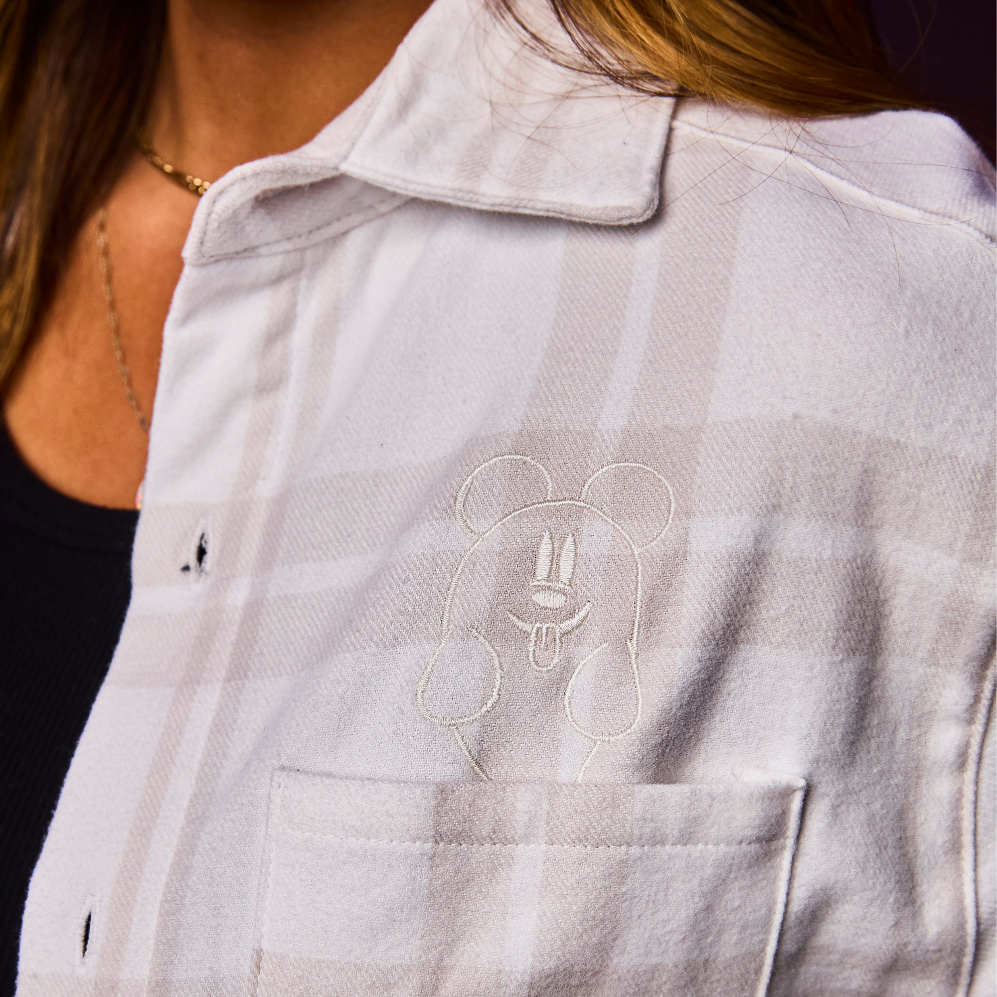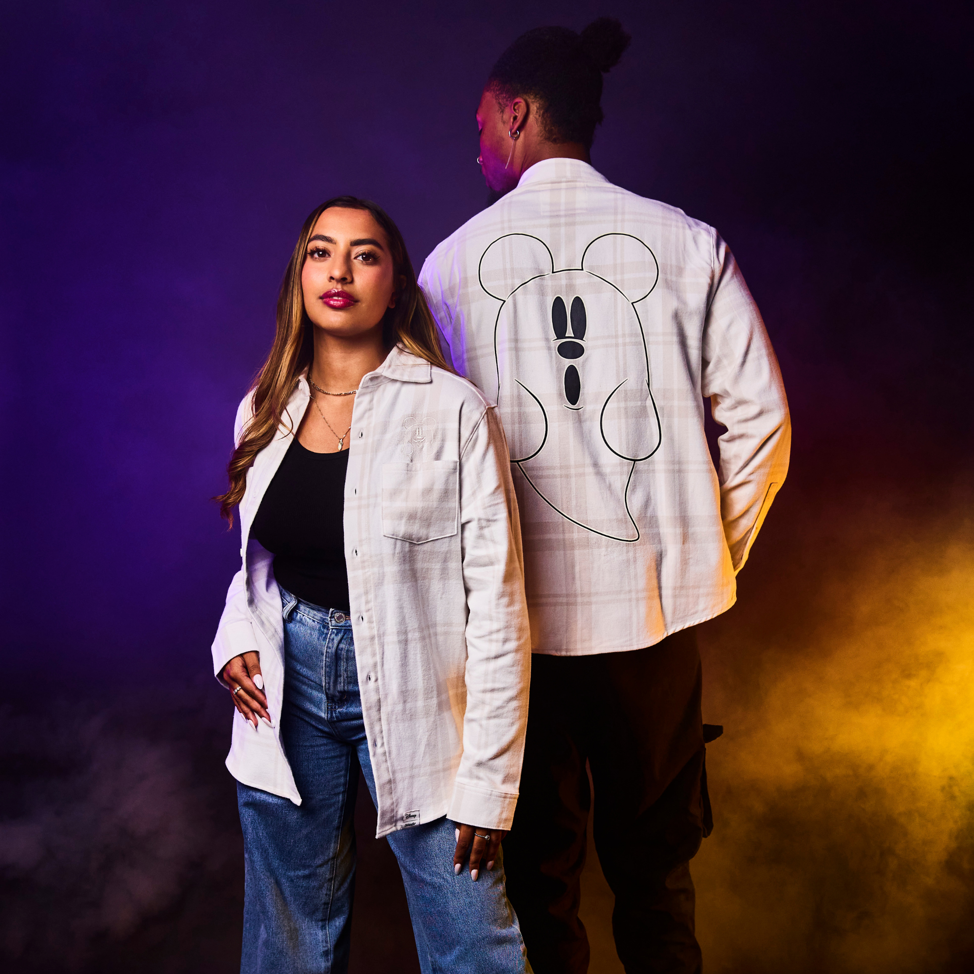 Now this is a BOO-tiful flannel. Our Disney’s Mickey Mouse inspired Ghost Glow Flannel is here to haunt your wardrobe with embroidered pocket and collar details and a back print of a glow-in-the-dark Mickey inspired Ghost.