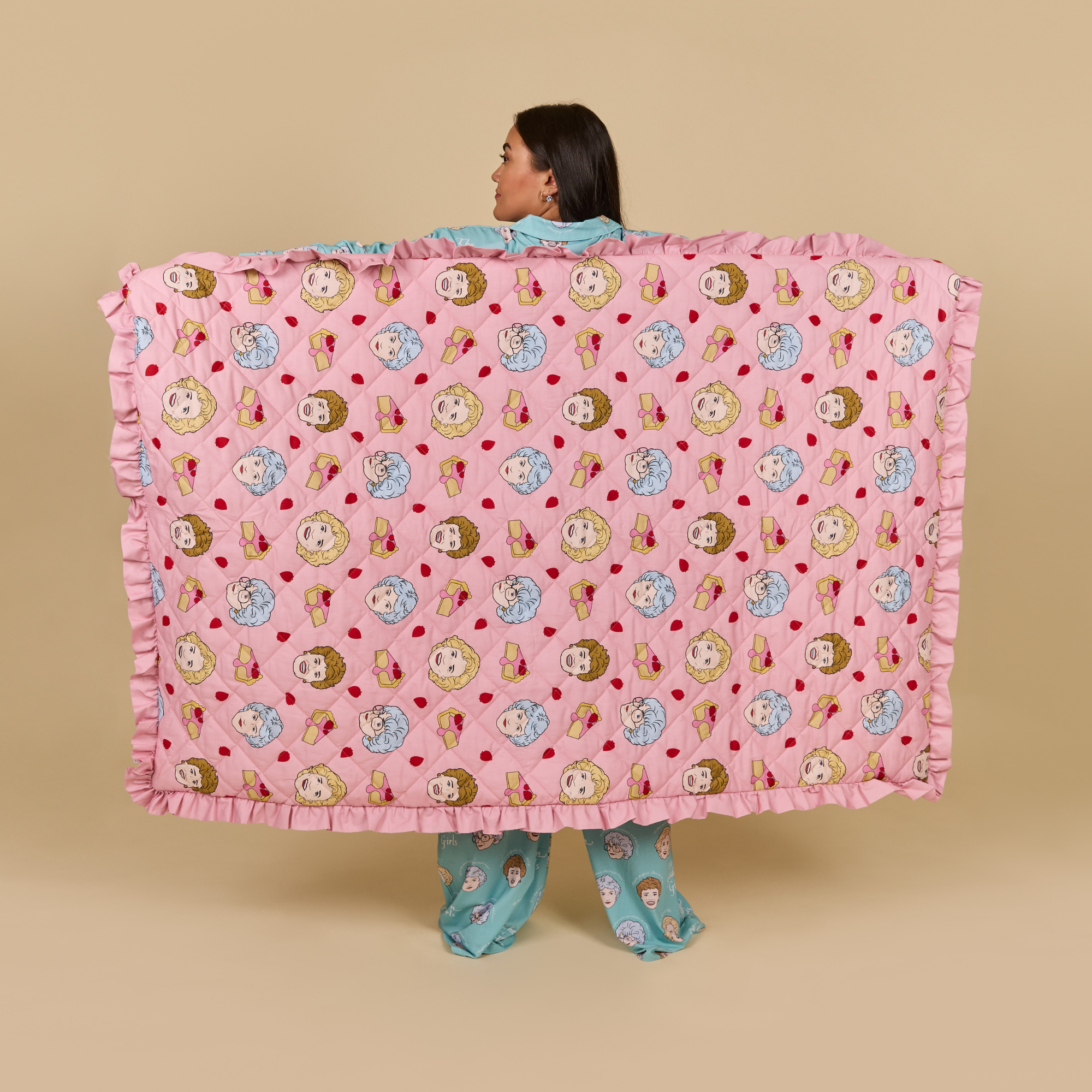 Our Golden Girls Quilted Blanket is perfect for couch naps, rewatch marathons, or hiding from your ex named Stan. Featuring an all-over print of Dorothy Zbornak, Rose Nylund, Blanche Devereaux, and Sophia Petrillo, this is a must-have for fans of the iconic sitcom.