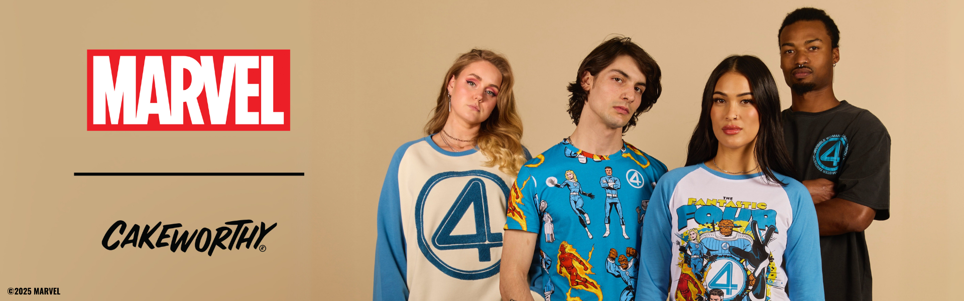 Welcome to the Family! Marvel’s First Family has officially landed at Cakeworthy. Our Fantastic Four apparel collection is a tribute to the legendary team, making their return in Marvel Studios’ highly anticipated Fantastic Four: First Steps (2025) movie. Inspired by the new era of Reed Richards (Pedro Pascal as Mr. Fantastic), Sue Storm (Vanessa Kirby as the Invisible Woman), Johnny Storm (Joseph Quinn as the Human Torch), and Ben Grimm (Ebon Moss-Bachrach as The Thing), this collection brings iconic powers, bold style, and a little cosmic chaos to your wardrobe. Our Fantastic Four collection features our Fantastic Four Flannel, Fantastic Four Crewneck, Fantastic Four Flannel Raglan, Fantastic Four Flannel Drop Sleeve T-Shirt, Fantastic Four Flannel AOP and our Fantastic Four Flannel HERBIE T-shirt Dress.