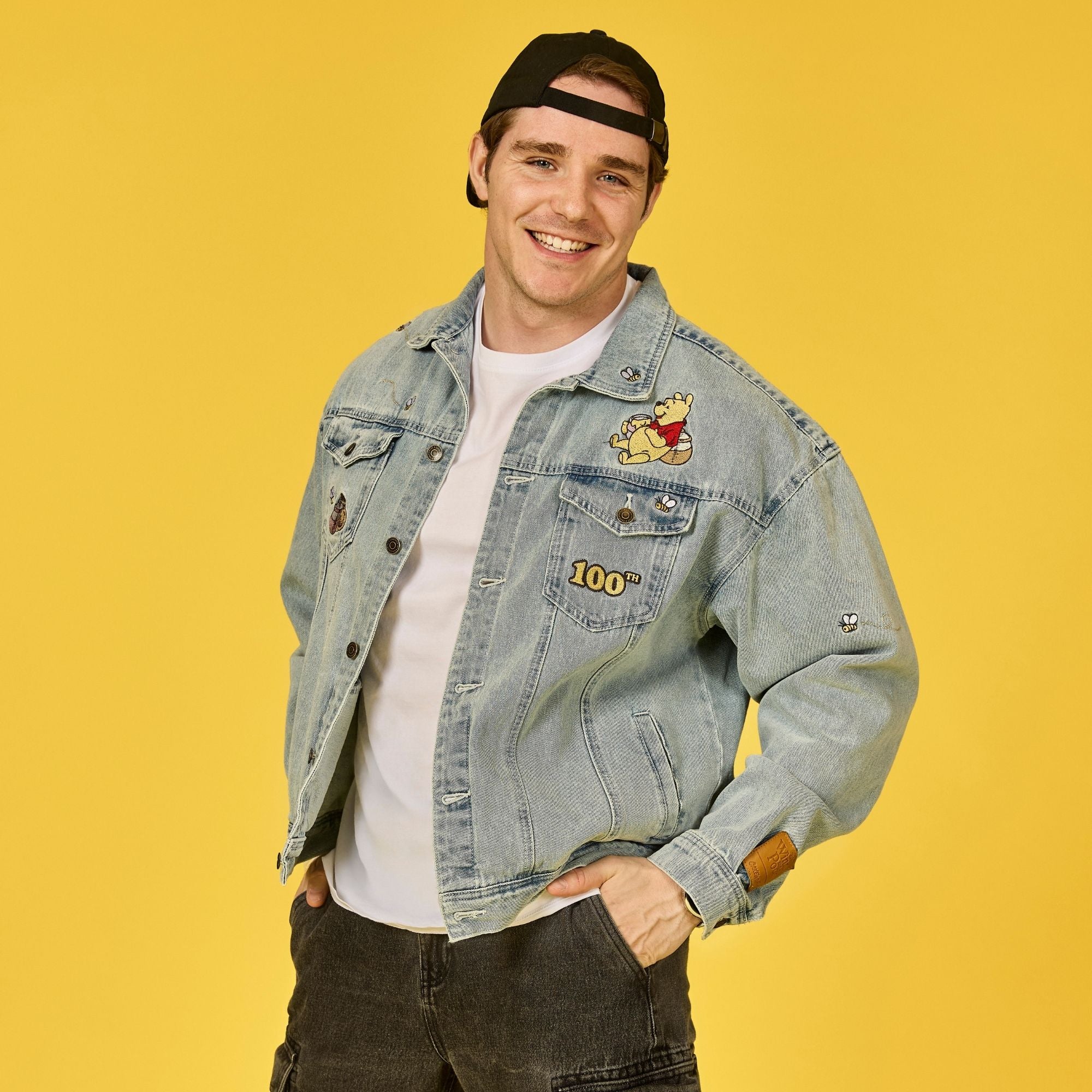 Any day spent in our Disney’s Winnie the Pooh 100th Anniversary Denim Jacket is our favorite day. This drop-sleeve denim jacket is a must-have for fans, showcasing beloved embroidered details from Disney's Winnie the Pooh. The back features Pooh Bear, Tigger, Eeyore, and Piglet, alongside the Disney's Winnie the Pooh logo. The front details include "100th," Hunny Pots, Pooh Bear, and busy little bumblebees.