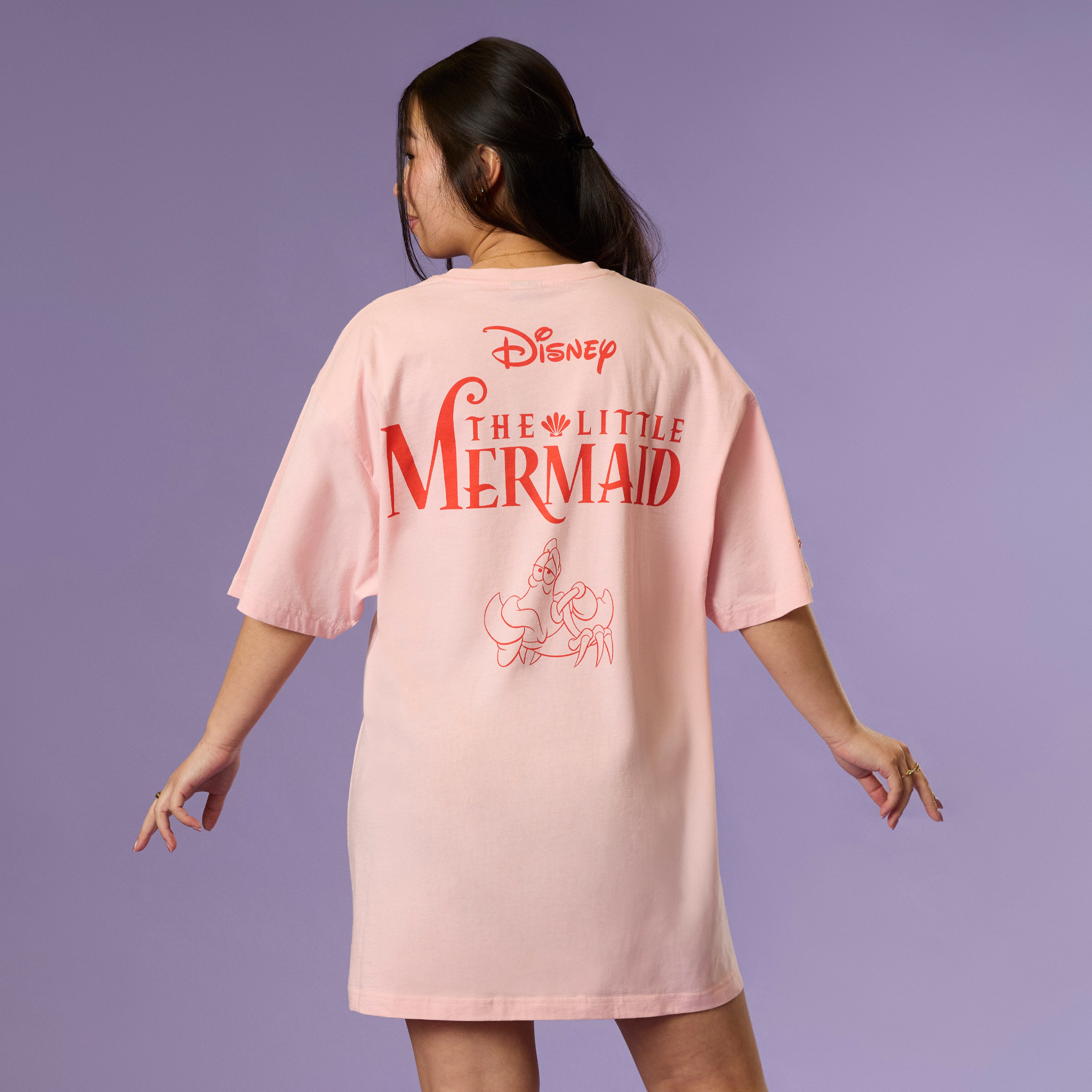 Our Disney Princess Ariel T-Shirt Dress is something beyond your wildest dreams. This mermaid-inspired dress is a muted red, paying homage to Ariel's red hair. It features a full front graphic of Ariel and Flounder, with the movie title Disney’s The Little Mermaid, and a graphic of Sebastian on the back. Complete with Ariel’s embroidered autograph on the sleeve, this t-shirt dress will make a splash in your wardrobe!