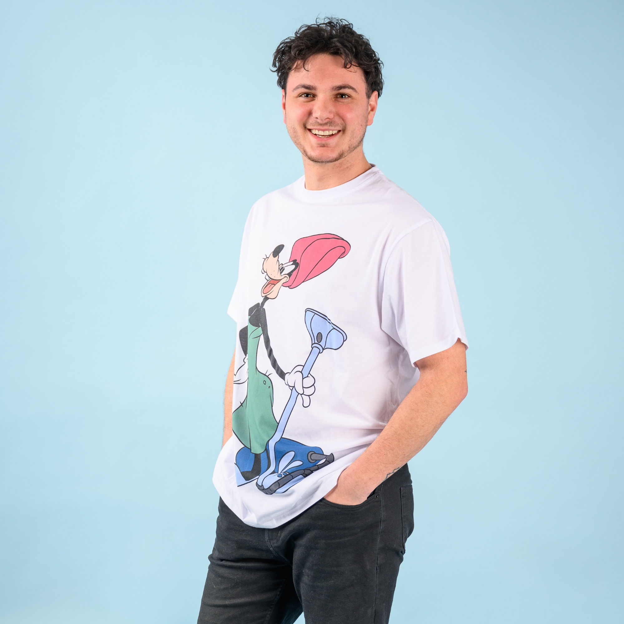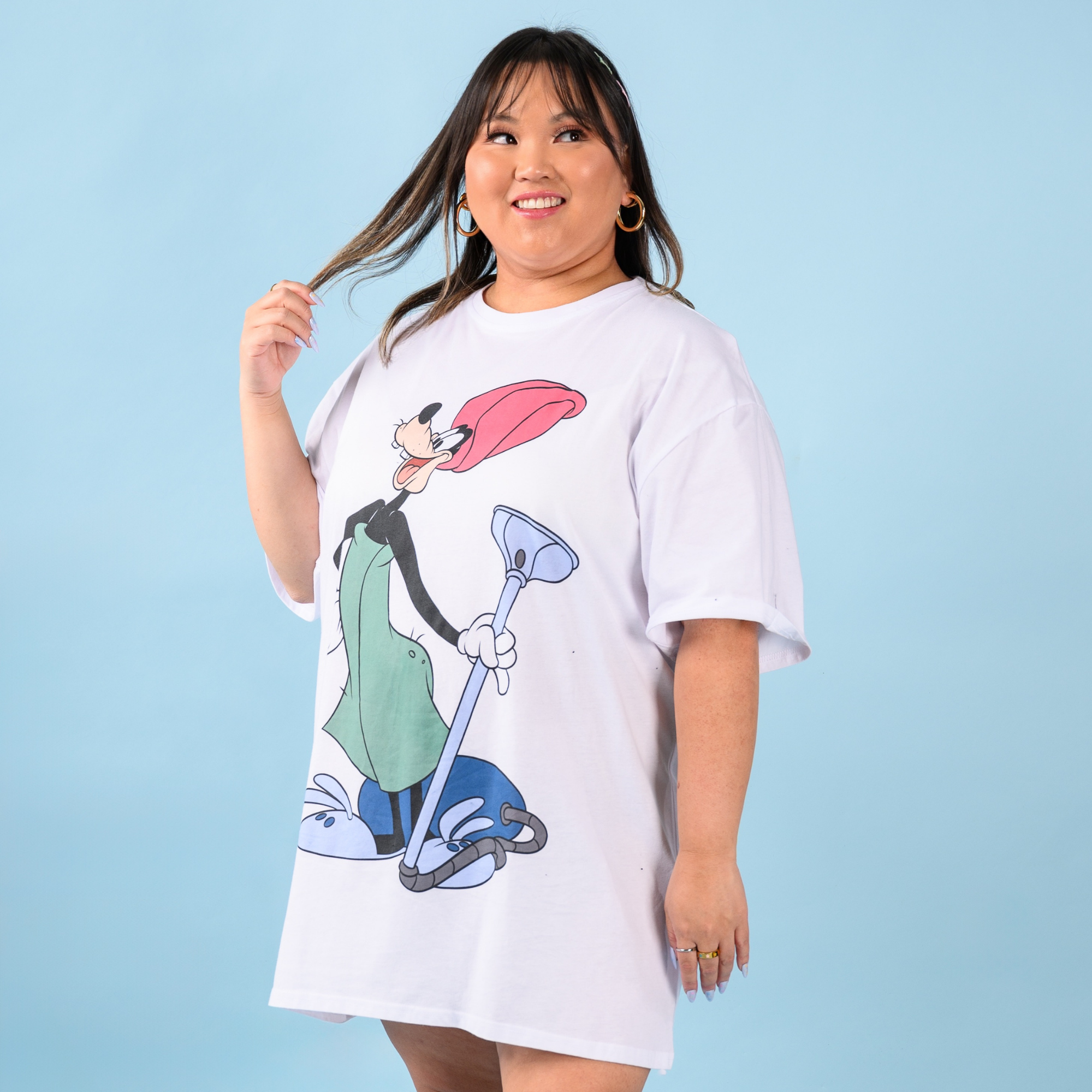 Everybody mambo! Our Disney’s Goofy T-Shirt Dress is perfect for any Disney fan lookin’ to add a little goofy style to their wardrobe. Inspired by A Goofy Movie, this fun and comfy t-shirt dress features Goofy on the front, rocking his towel and bunny slippers while vacuuming. The back showcases the iconic A Goofy Movie logo for an added touch of nostalgia.